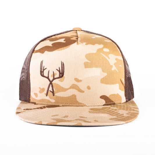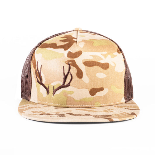 Desert Camo/Brown Embroidered Closed-Antler Trucker Cap (Flat Bill)